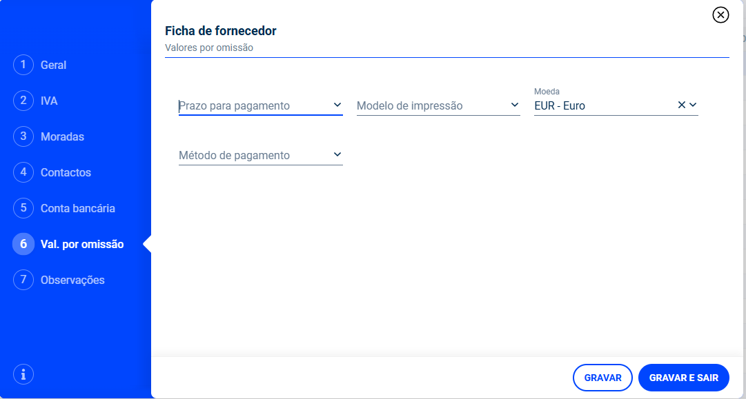 Modelo de impressão: Permite definir um modelo de impressão a aplicar ao fornecedor, quando se pretende um modelo diferente do configurado nos modelos de impressão e/ou nas séries de documentos. Saiba mais acerca dos modelos de impressão, clicando aqui.
