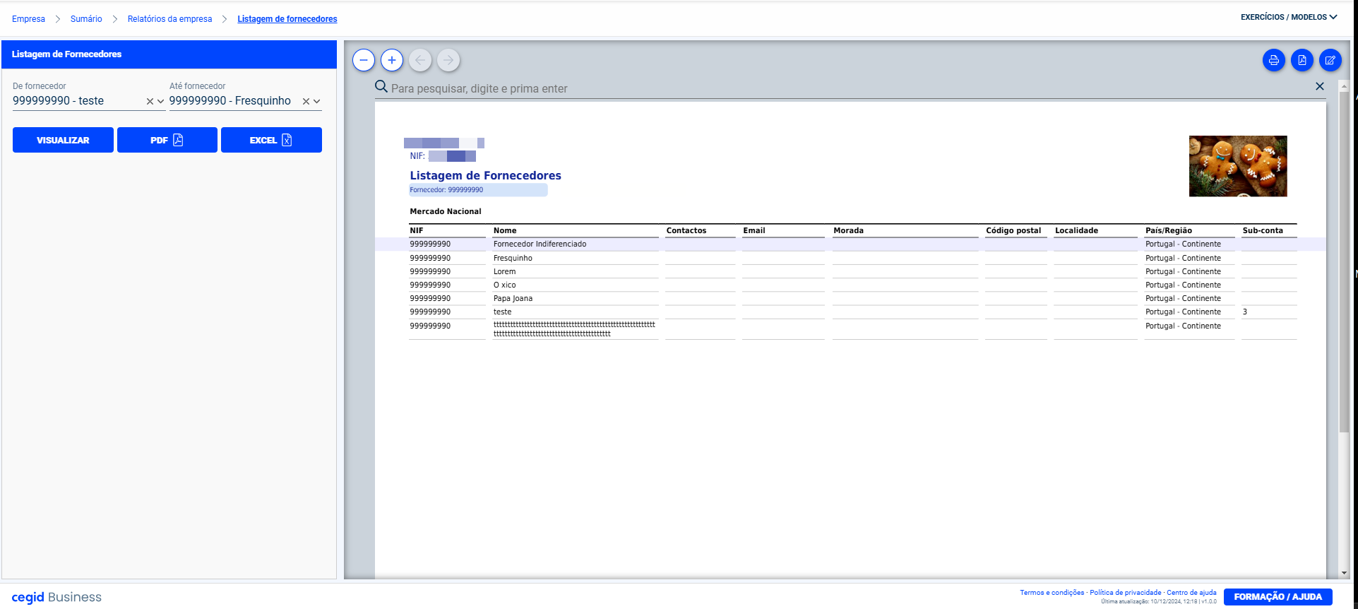 Após o preenchimento dos filtros, bastará clicar em Visualizar e o relatório será apresentado no programa. É também possível descarregar o relatório em PDF ou Excel, clicando nos respetivos botões.