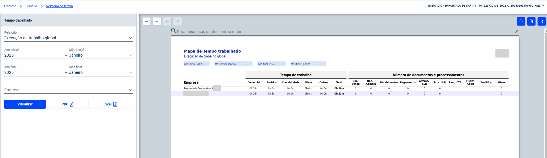 Caso selecione a opção Execução de trabalho global, poderá consultar os valores totais de tempo despendido, por empresa, por todos os colaboradores.