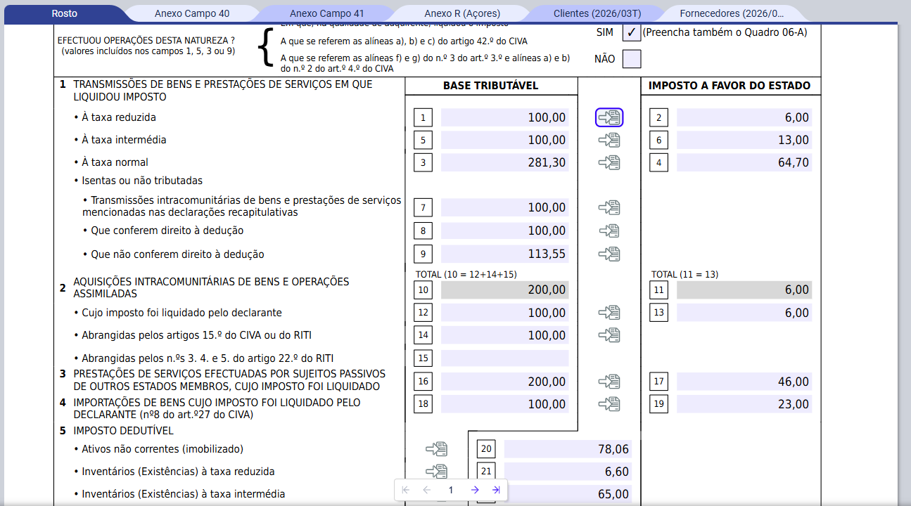 Caso pretenda conferir quais os lançamentos que estão a levar ao preenchimento de cada campo, pode clicar no ícone ao lado de cada campo e será aberto o mapa de conferência, filtrado pelos códigos de IVA e respetivos lançamentos, que preenchem o campo selecionado.