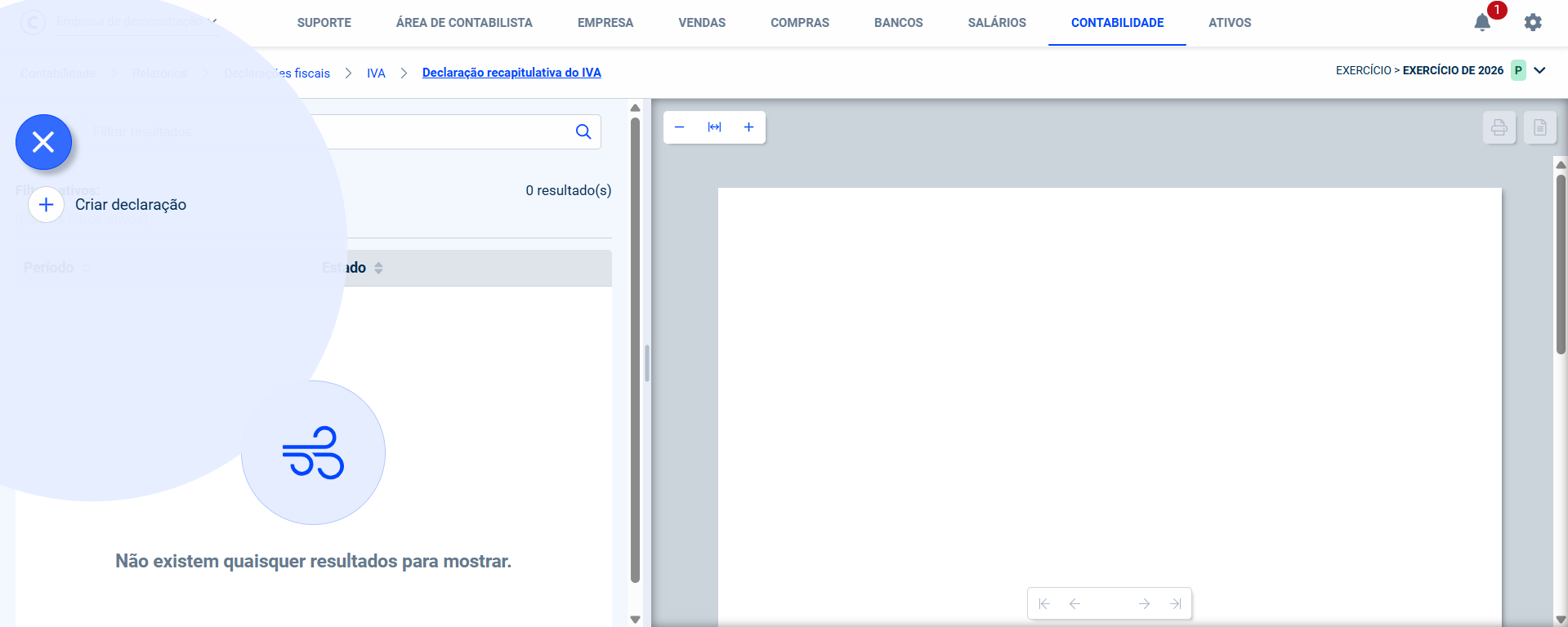 Para criar a declaração, deverá aceder ao menu Contabilidade > Relatórios > Declarações e entrar na opção Declaração Recapitulativa. Aqui, deverá selecionar o botão circular no canto superior esquerdo e clicar em Criar declaração, indicando o período a que diz respeito a declaração e o tipo de declaração.