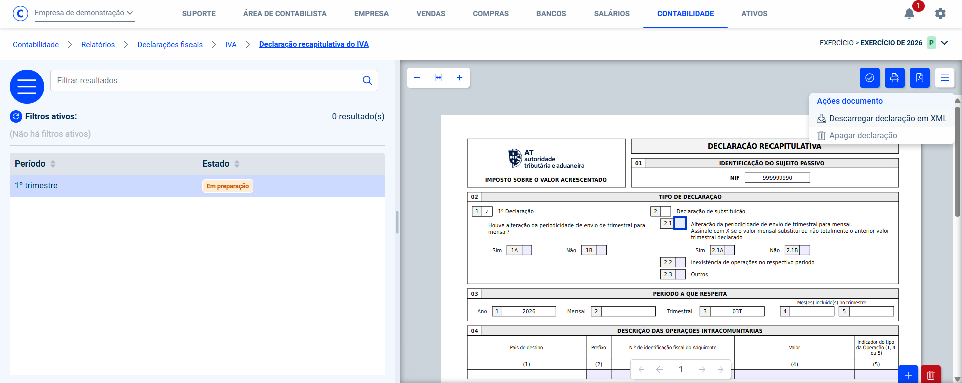 As tarefas de geração, validação, conferência e submissão das Declarações Periódicas e Recapitulativas de IVA estão posicionadas no menu Contabilidade >Relatórios > Declarações.