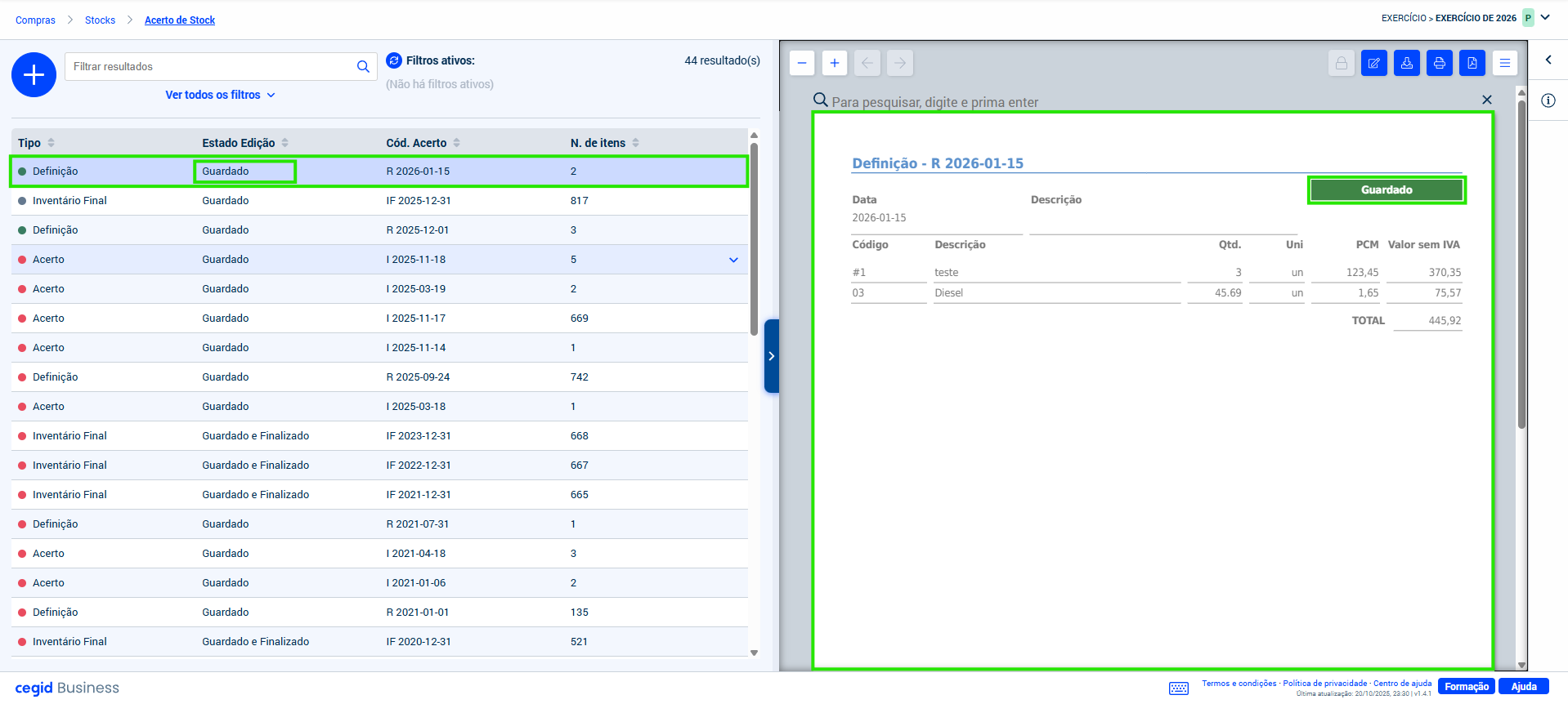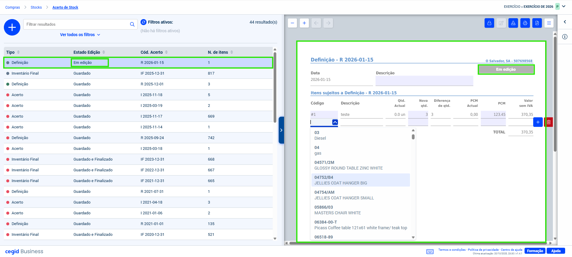 O menu Compras > Stocks > Acertos de stock permite o acesso à criação dos documentos de regularização de stock Acerto de quantidade e Definição de stock, apresentando do lado esquerdo, em linha, a lista de documentos de regularização existentes, e do lado direito (se a aba não se encontrar colapsada) o conteúdo do registo selecionado na lista.