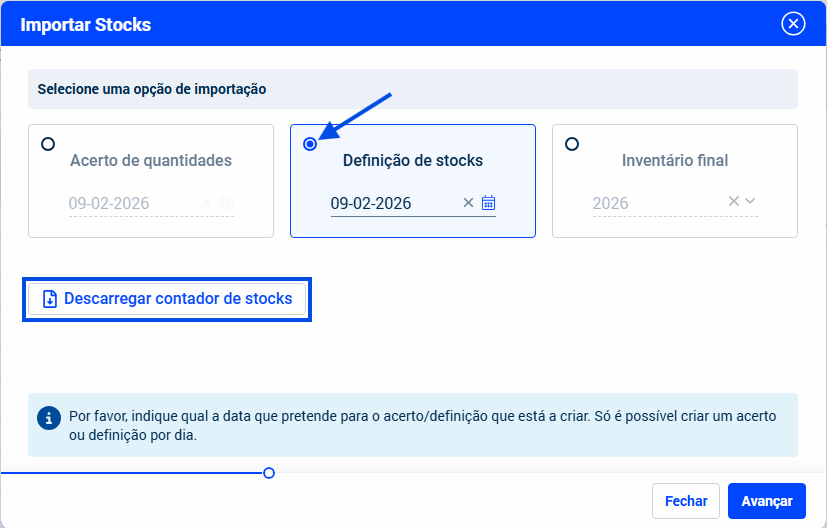 Em alternativa ao preenchimento manual, a Definição de stock poderá ser efetuada a partir do carregamento de um ficheiro Excel. Para tal, primeiramente, deverá descarregar o ficheiro Excel, através da opção Descarregar contador de stocks, presente no assistente de Importação de Stocks, que é lançado a partir do botão circular no canto superior esquerdo da página de Acerto de stocks.