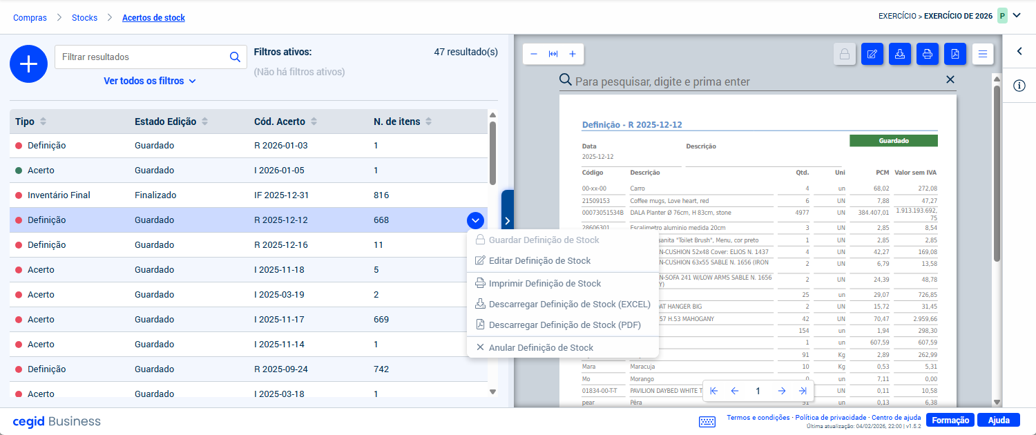 Os documentos de definição de stock podem também ser impressos, ou descarregados em formato Excel ou PDF.
